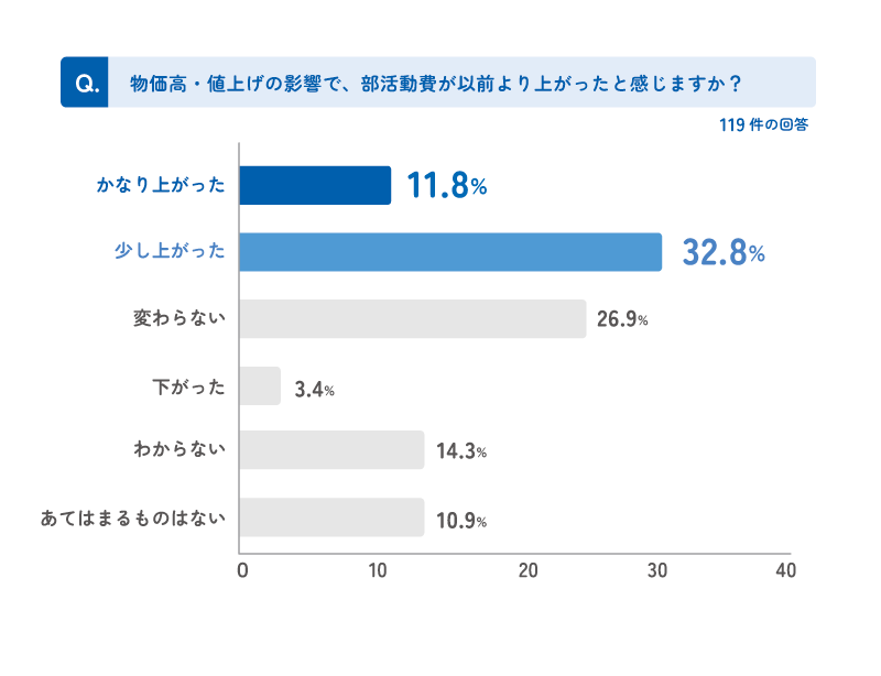 物価高・値上げの影響で部活動費が以前より上がったと感じるかを調査したところ、「かなり上がった」が11.8%、「少し上がった」が32.8%となり、合計44.6%の保護者が費用負担の増加を実感していることが明らかになりました。