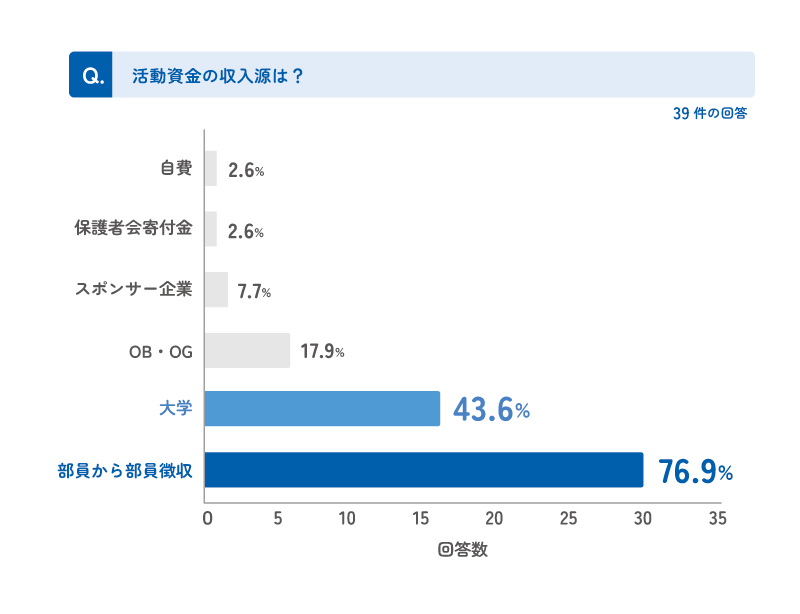 運動部の収入源を調査したところ、部費徴収が76.9%を占め、大学からの支援や外部スポンサーからの収入は限定的でした。