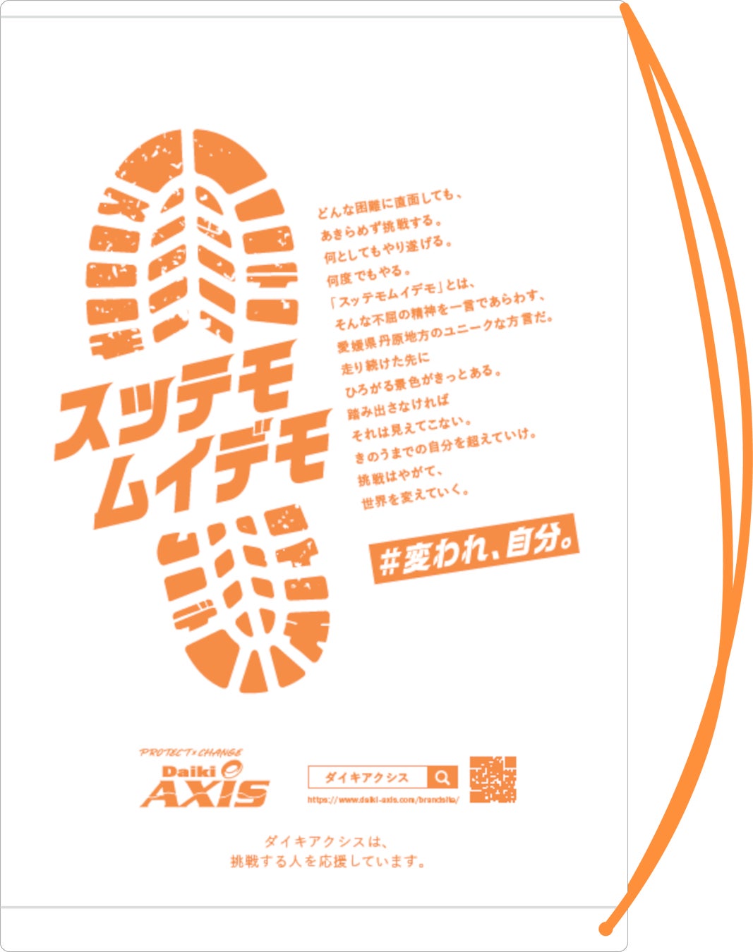 ダイキアクシスグループから、伊予路を駆け抜けるランナーの皆さまへ、『どんな困難に直面しても、あきらめず挑戦する。』そんな「不屈の精神」に対する思いを込めた手荷物預け袋となっておりますので、ぜひ確認してみてください。