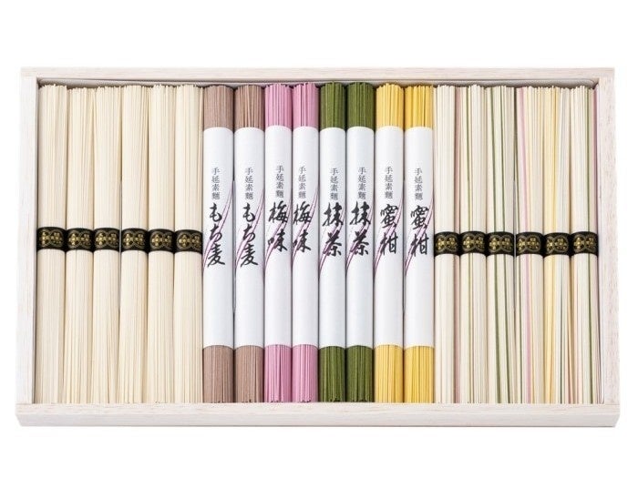 寛永12年(1635年)に伊予・松山で創業して以来、三百八十余年にわたるそうめん作りの歴史があります。享保7年(1722年)、八代目長門屋市左衛門の娘が椿神社へ参拝の折、美しい五色の糸が下駄に絡みついたのを見て、「そうめんに五色の色をつけてみては?」と父親にすすめたのがきっかけ。5色に彩られたそうめんが時の将軍や朝廷から称えられて、「五色そうめん」の名は全国に知れ渡るように。長い歴史の中で時代とともに変化を加えながら自然の素材にこだわり、梅肉や抹茶などを練り込んだ鮮やかな色彩と、手延べそうめんならではの強いコシと滑らかな食感を守り続けています。