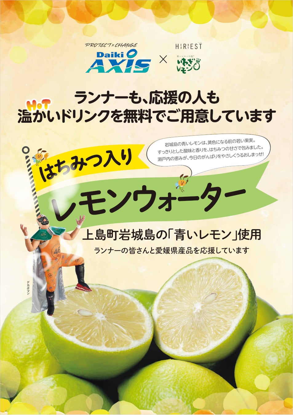 瀬戸内海に浮かぶ岩城島(いわぎじま:愛媛県上島町)産の「青いレモン」を使用した温かいはちみつレモンウォーターをご用意し、前日受付の1月31日午後および大会当日の2月1日に提供いたします。なお、数量限定となり、にゅうめん提供時など時間帯によっては、はちみつレモンウォーターの提供を制限させていただく場合がありますので、ご了承ください。