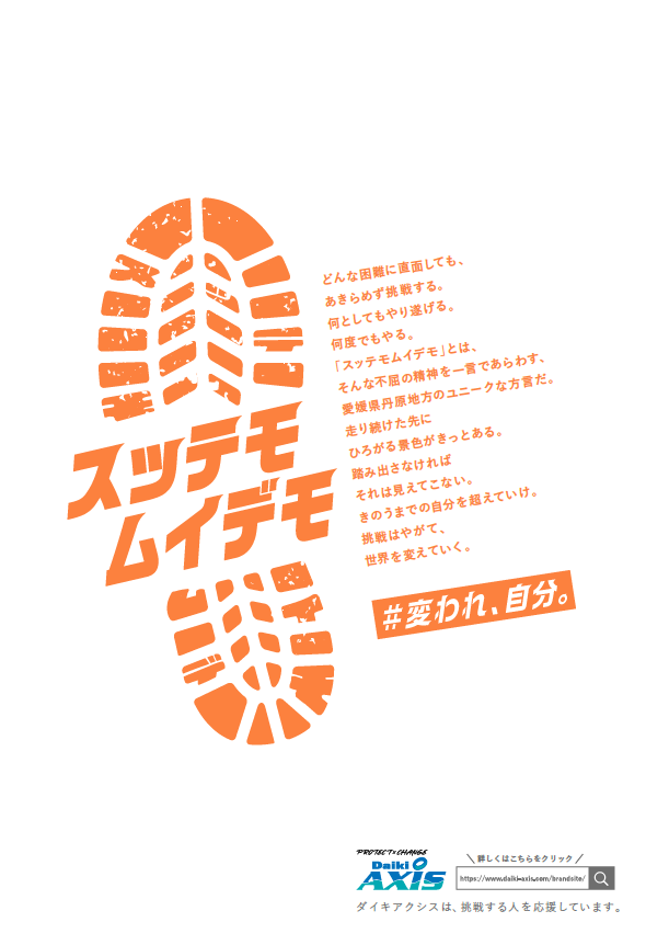 今回、一部ランナーの皆さまへ配布させていただく手荷物預け袋に、『スッテモ ムイデモ』という言葉をプリントしております。「スッテモ ムイデモ」とは、愛媛県丹原地方(西条市)の方言で「なにがなんでも」「是が非でも」という意味です。当社グループの創業者である大亀孝裕がよく口にしていた言葉で、現在の当社クレド(行動指針)の元となっている「社訓」にも含まれております。