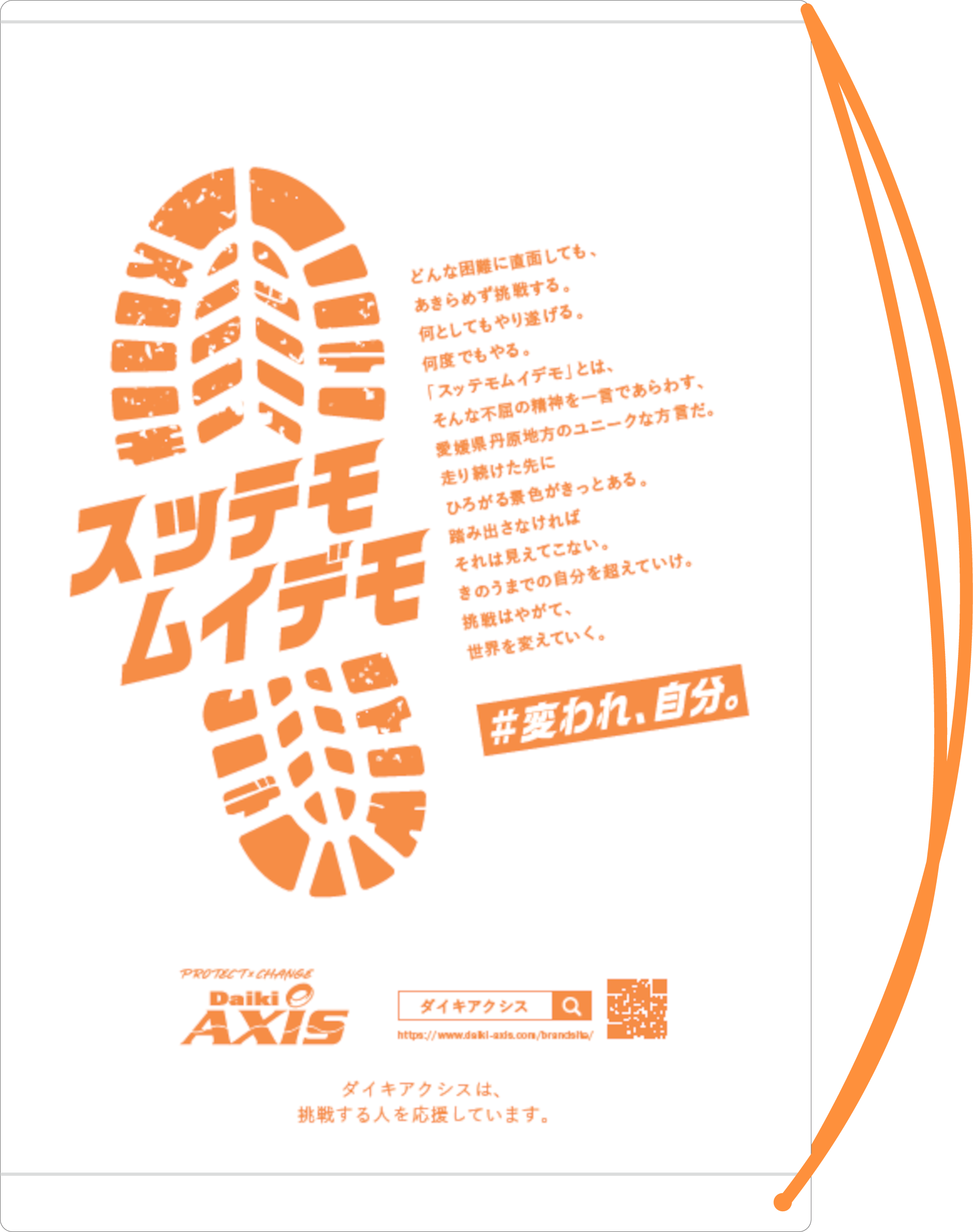 ダイキアクシスグループから、伊予路を駆け抜けるランナーの皆さまへ、『どんな困難に直面しても、あきらめず挑戦する。』そんな「不屈の精神」に対する思いを込めた手荷物預け袋となっておりますので、ぜひ確認してみてください。