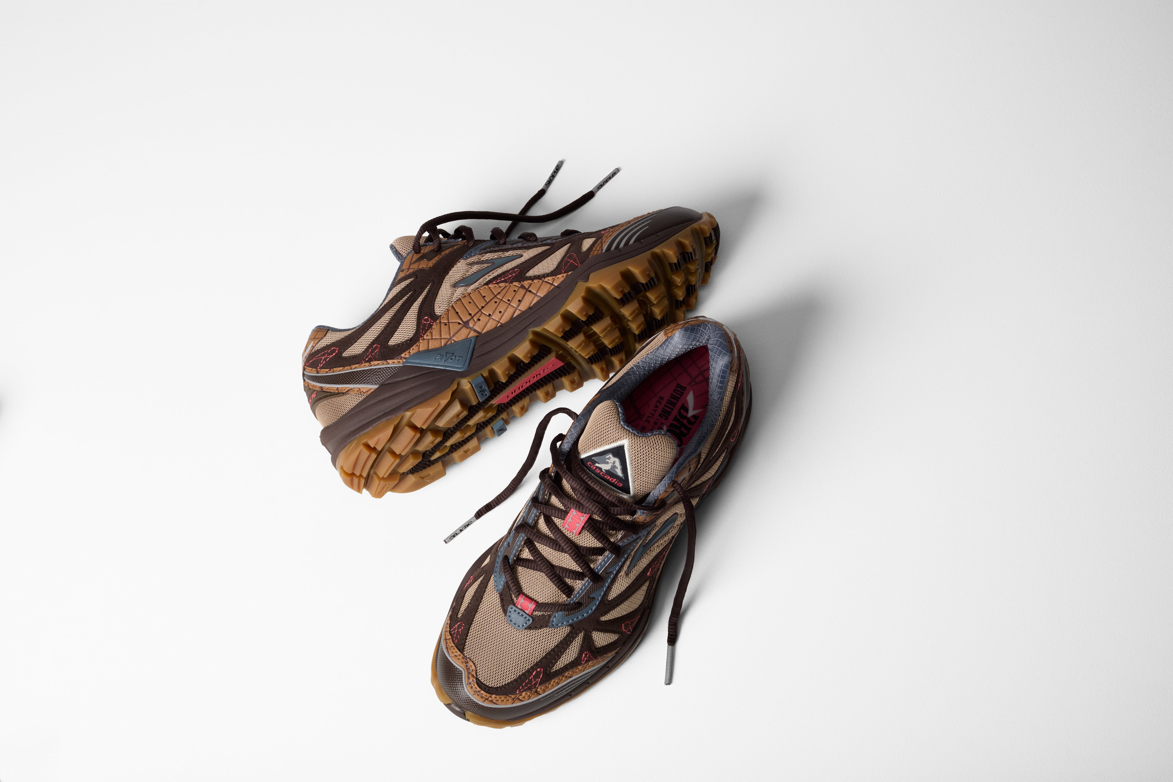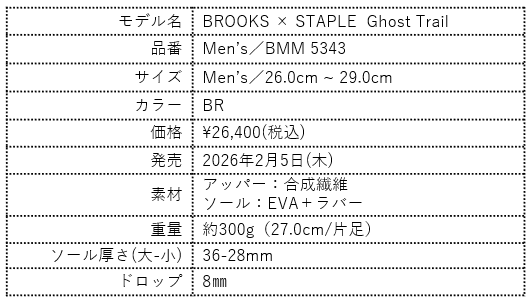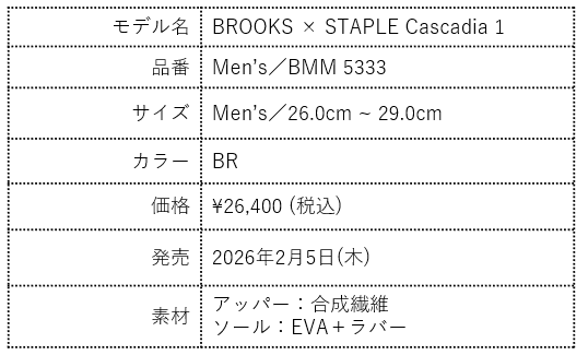 今回のコラボレーションは、BROOKSが培ってきたトレイルランニングのDNAと、STAPLEが象徴する都市の感性が融合した特別なプロジェクトです。昨年3月にリリースされた第一弾に続き、BROOKSとSTAPLEが再びタッグを組み、ブランドのアーカイブを象徴する「Cascadia 1」と、日本での本格展開に先駆けて登場するトレイルモデル「Ghost Trail」を現代的に再構築しました。