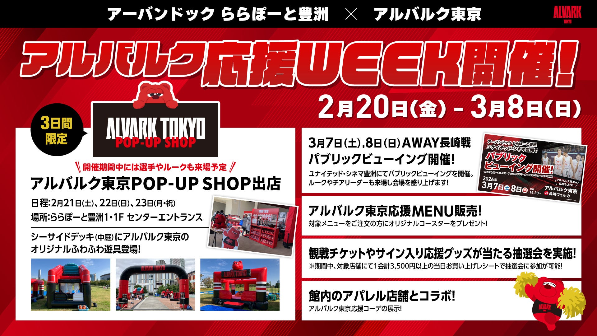 この度アルバルク東京では、2026年2月20日(金)~3月8日(日)の期間で、アーバンドック ららぽーと豊洲にて「アルバルク応援WEEK」の開催が決定いたしました。