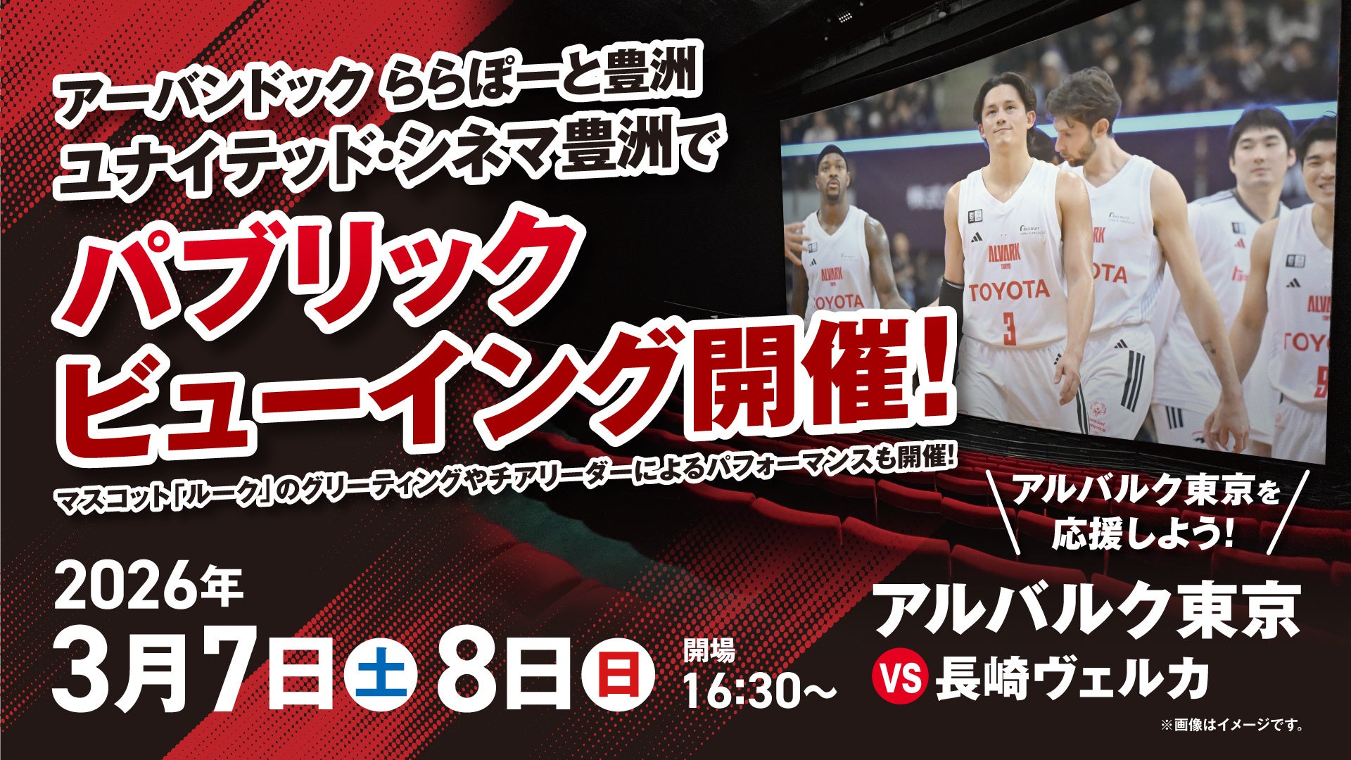 さらに、「アルバルク応援WEEK」最終2日間となる3月7日(土),8日(日)は施設内にある映画館「ユナイテッド・シネマ豊洲」にてAWAY長崎ヴェルカ戦のパブリックビューイングを開催いたします!