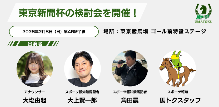 スポーツ報知を発行する報知新聞社(代表取締役社長・長谷川剛)は2月8日(日)東京競馬場ゴール前特設ステージにて、同日に開催される東京新聞杯・GⅢの検討会を第4R終了後から約20分間実施します。検討会には、司会にアナウンサー大塩由起さんを迎え、スポーツ報知競馬記者・大上賢一郎記者、角田晨記者、馬トクスタッフが出演。各出演者が本命馬や穴馬をピックアップし、見どころや狙いどころを解説します。スポーツ報知の競馬専門サイト「馬トク」のデータを使用した予想も披露予定です。東京新聞杯の馬券検討に役立つヒントをぜひ会場でチェックしてください。