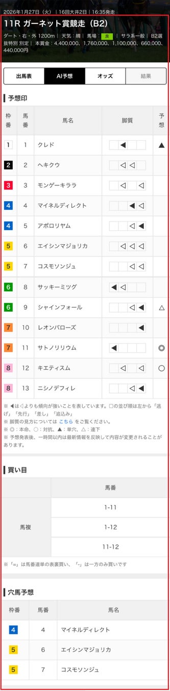本ウィジェットの提供にあたり、当社の独自 AI エンジン「 KAIBA 」をベースに、スポーツナビ専用のオリジナル AI モデルを新たに開発。本コンテンツでは、この専用 AI が算出した「予想印」を提供いたします。