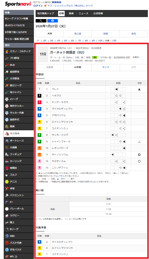 ・地方競馬 全レースの出馬表・オッズ・レース結果