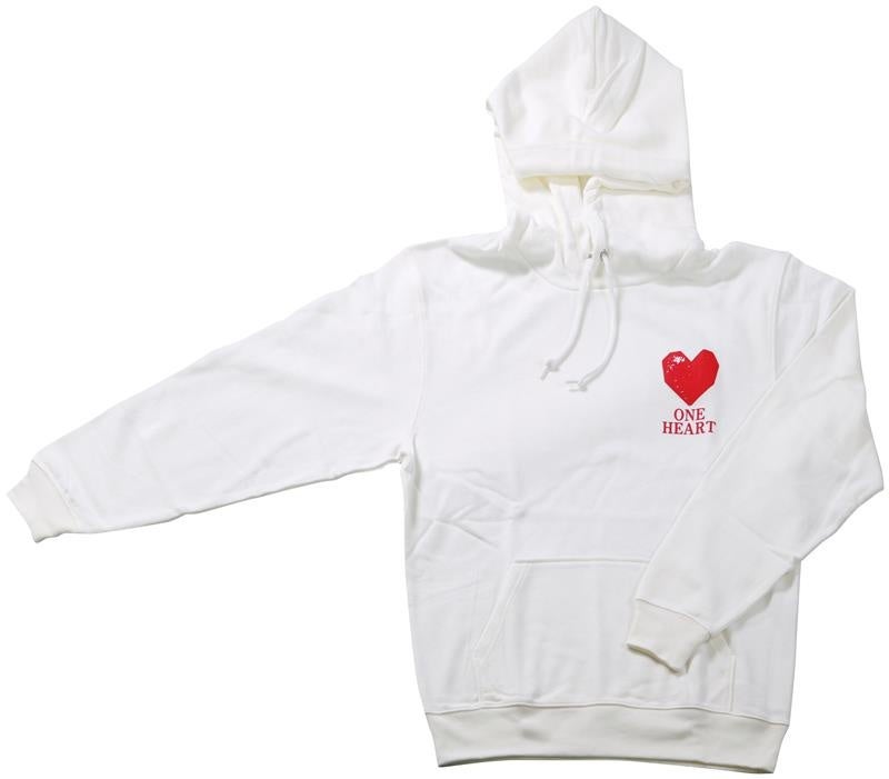 ONE HEARTの文字をあしらったパーカー。胸元にハートと、背中にボールの縫い目をハートで表したデザイン。Lサイズのみですが、オーバーサイズでもかわいく着られます。