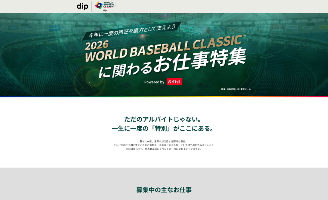 ディップ株式会社(以下「当社」)は、2026年3月5日(木)から3月10日(火)にかけて東京ドームで開催される「2026 World Baseball Classic® Tokyo Pool by dip」(以下「本大会」)のメインスポンサーとして、2026年2月2日(月)より、観戦チケットプレゼントキャンペーンを開始いたします。さらに大会会場でのアルバイトを「バイトル」限定で募集する企画を実施するなど「はたらく」をテーマに大会を盛り上げてまいります。
