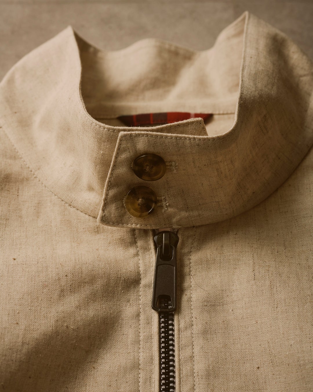 素材には、綿50%・麻50%のコットンリネンを使用。BARACUTAらしいハリ感を残しつつ、リネン特有のドライな肌触りと清涼感をプラスした。着込むほどに増す自然なシワ感も魅力で、春夏シーズンに軽やかに羽織れる一着となっている。裏地には、ブランドを象徴するフレイザータータンチェックのパイピングを施し、脱いだ際にも高揚感を演出。伝統とアップデートが共存する、大人のための新しいスタンダードが完成した。