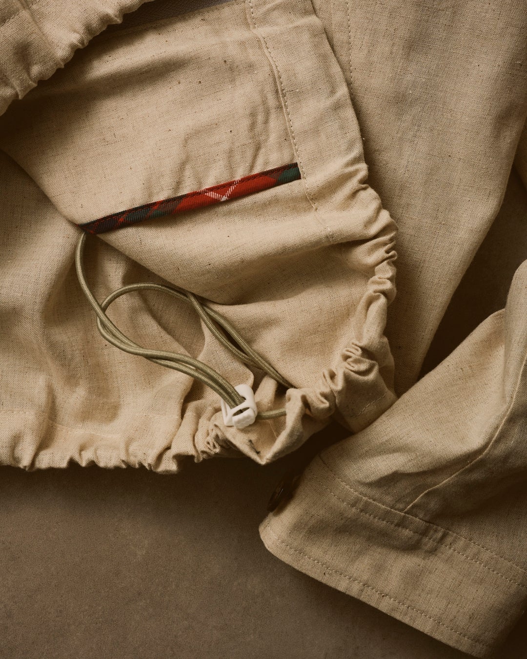 袖口と裾にリブを設けないスマートなデザインが特徴で、今回の別注ではそのクラシックな佇まいを活かしながら、今の気分にフィットするサイズ感と機能性をプラスした。最大の別注ポイントは、裾に配したドローコード(スピンドル)。絞らずに着用すればG4本来のストンと落ちるボックスシルエット、絞ることでG9を彷彿とさせる丸みのあるバルーンシルエットへと変化。スタイリングやボトムスに合わせて表情を変えられる、2WAY仕様となっている。