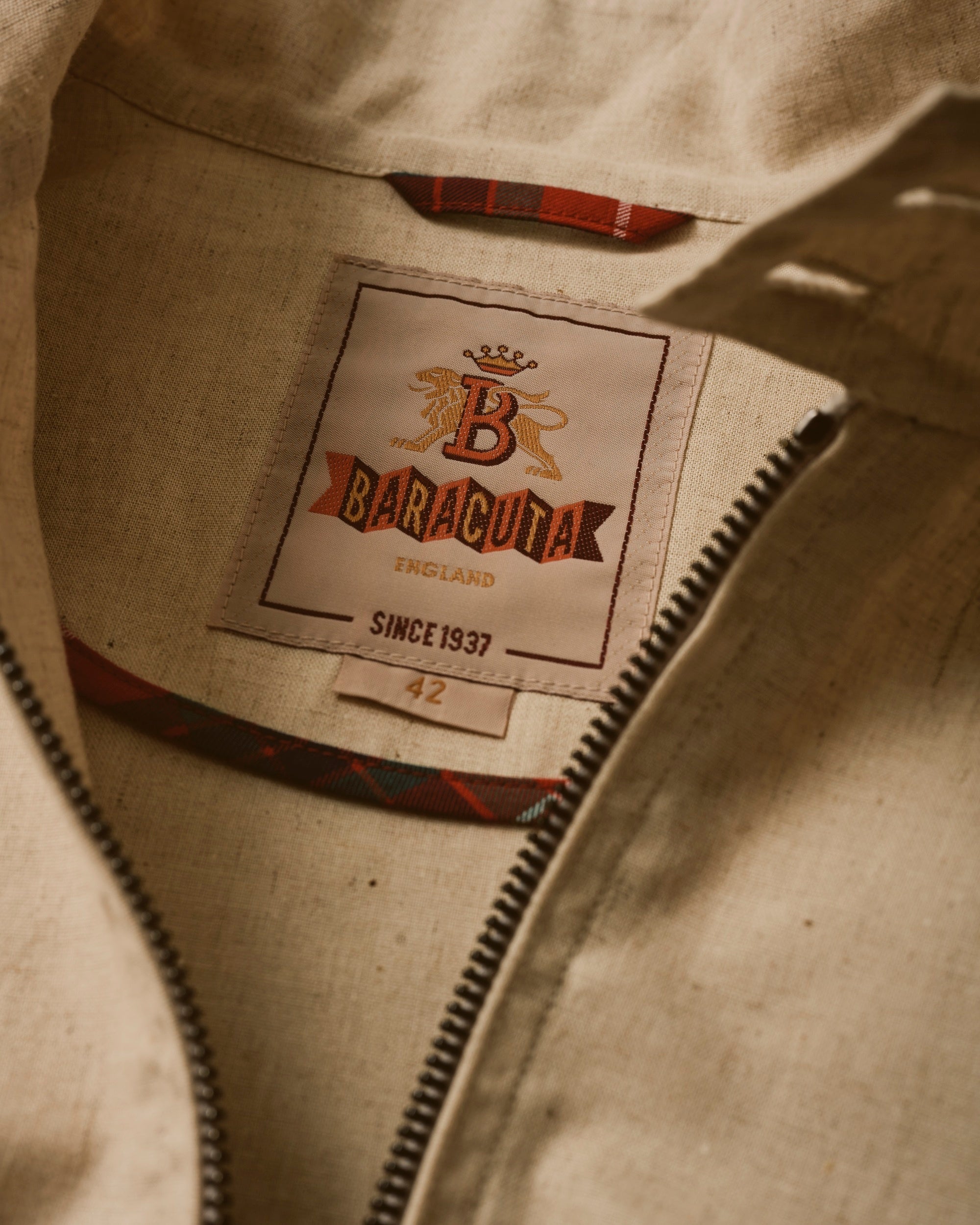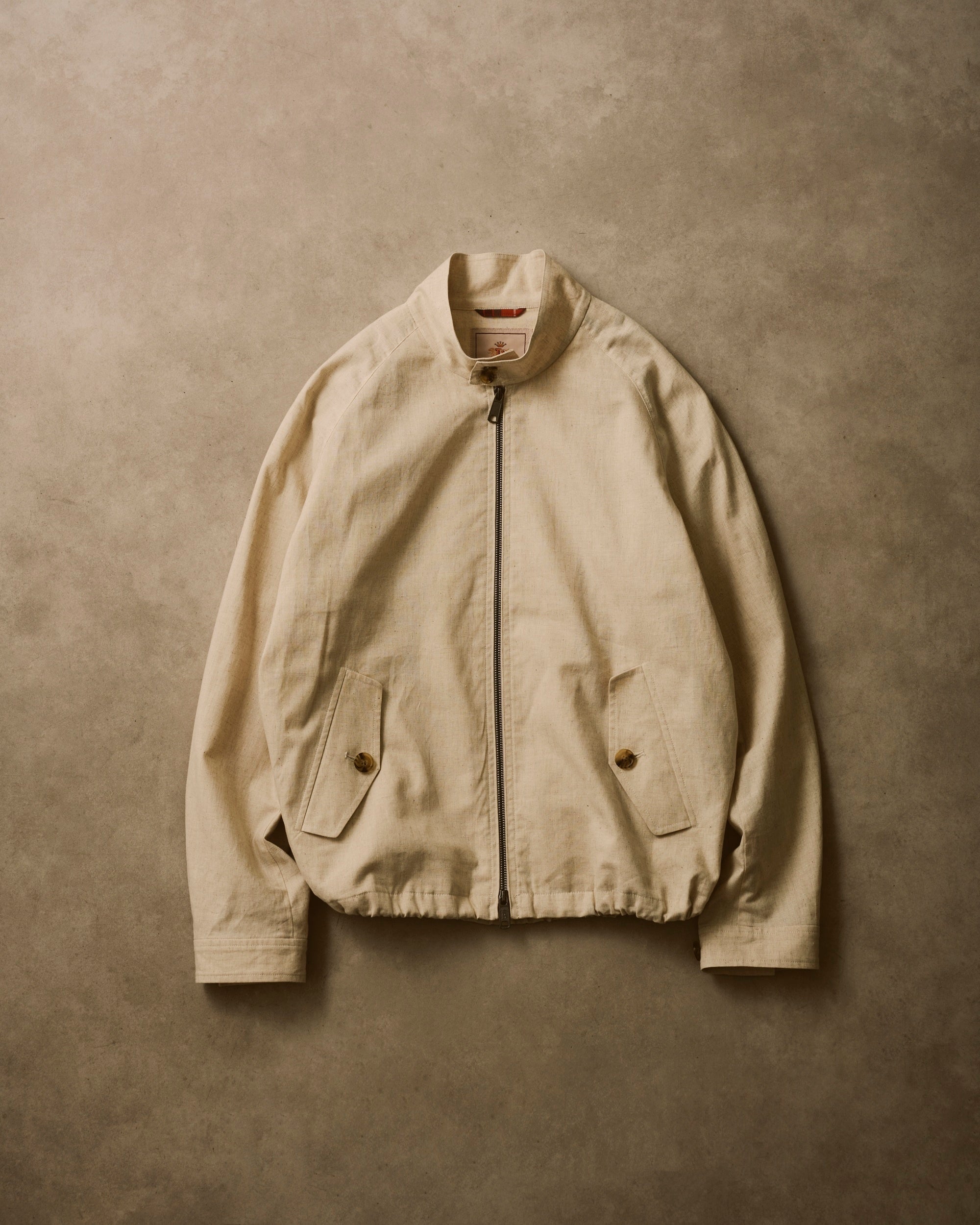素材には、綿50%・麻50%のコットンリネンを使用。BARACUTAらしいハリ感を残しつつ、リネン特有のドライな肌触りと清涼感をプラスした。着込むほどに増す自然なシワ感も魅力で、春夏シーズンに軽やかに羽織れる一着となっている。裏地には、ブランドを象徴するフレイザータータンチェックのパイピングを施し、脱いだ際にも高揚感を演出。伝統とアップデートが共存する、大人のための新しいスタンダードが完成した。