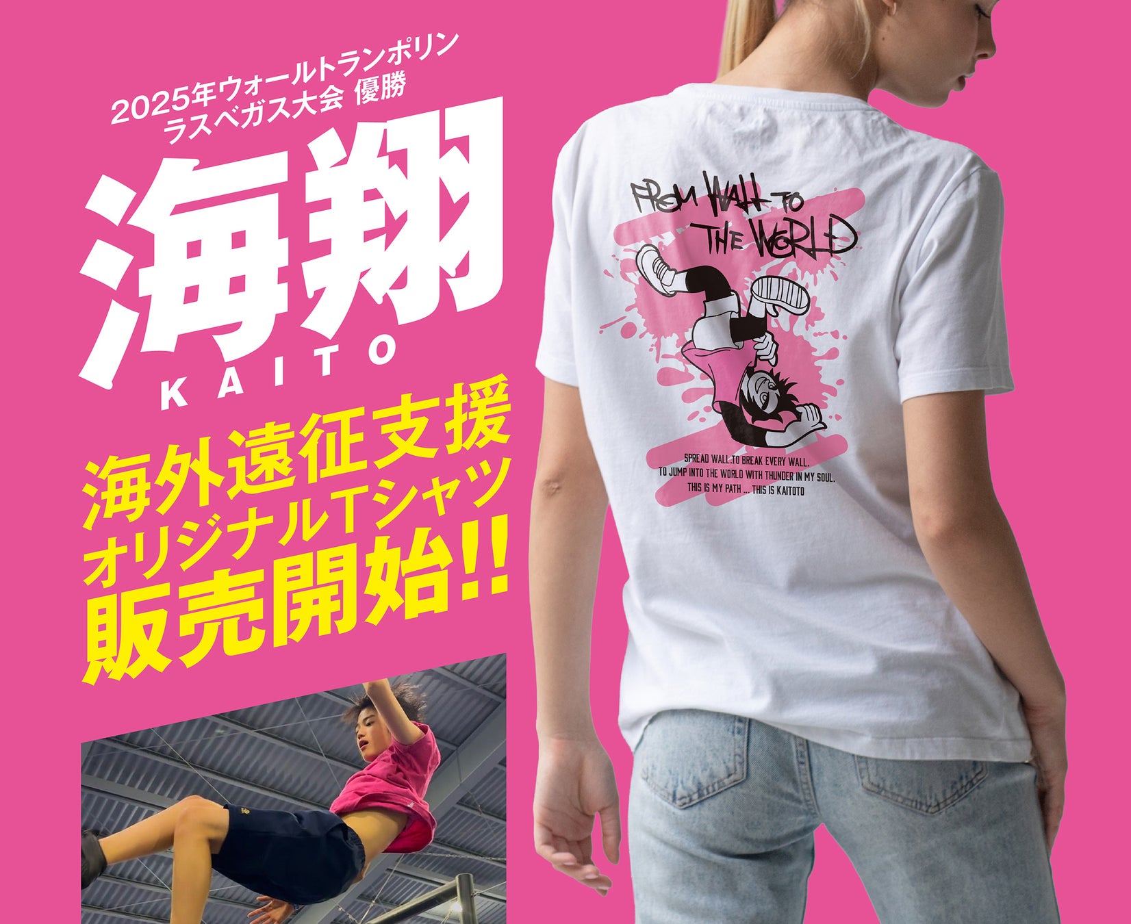 ウォールトランポリン競技で世界大会優勝経験を持つ日本人中学生アスリート・海翔くんが、今年2月7日の米ラスベガス国際大会で前人未到の2連覇に挑戦。オリジナルTシャツ販売による支援プロジェクトも開始する。
