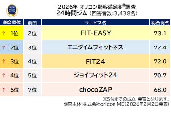 『24時間ジム』総合ランキング(2026年 オリコン顧客満足度®調査)
