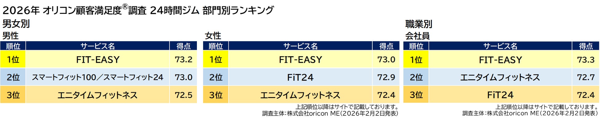 『24時間ジム』部門別ランキング「男女別/職業別」(2026年 オリコン顧客満足度®調査)