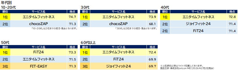 『24時間ジム』部門別ランキング「年代別」(2026年 オリコン顧客満足度®調査)