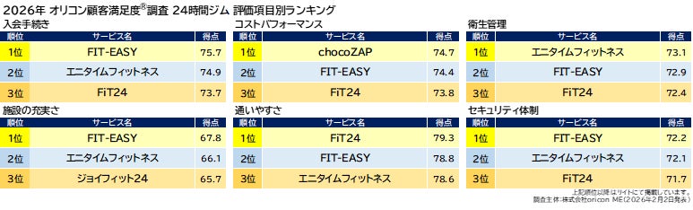 『24時間ジム』評価項目別ランキング(2026年 オリコン顧客満足度®調査)