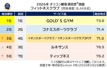 『フィットネスクラブ』総合ランキング(2026年 オリコン顧客満足度®調査)