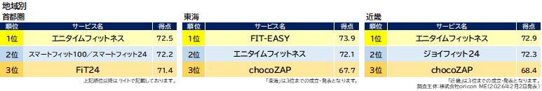 『24時間ジム』部門別ランキング「地域別」(2026年 オリコン顧客満足度®調査)