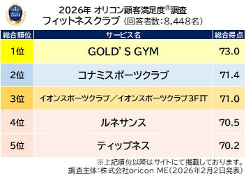 オリコン株式会社(本社:東京都港区 代表取締役社長:小池 恒、略称:オリコン)は、グループ会社である株式会社oricon MEが、実際のサービス利用者を対象に第三者の立場で実施した、『フィットネスクラブ』『24時間ジム』についての顧客満足度調査の結果を、2026年2月2日(月)14時に「オリコン顧客満足度®」公式サイト内にて発表いたしました。( https://life.oricon.co.jp/ )