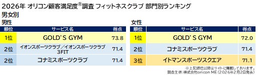 『フィットネスクラブ』部門別ランキング「男女別」(2026年 オリコン顧客満足度®調査)