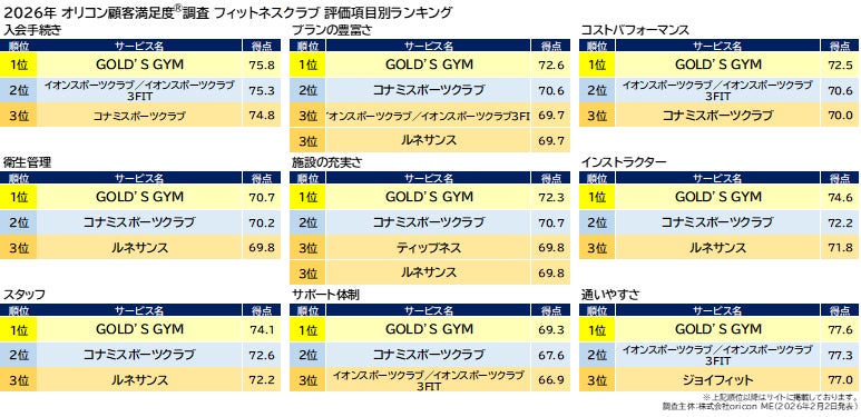 『フィットネスクラブ』評価項目別ランキング(2026年 オリコン顧客満足度®調査)