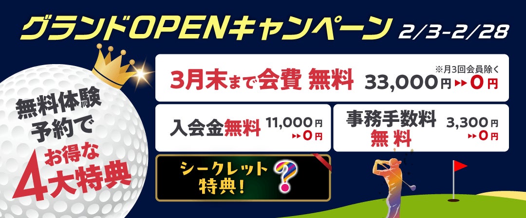 「入会金」「事務手数料」「3月末までの会費」がそれぞれ無料になるほか、「シークレット特典」を含む4大特典をご用意しています。ぜひこのグランドオープンの機会にお得なキャンペーンをご利用ください。