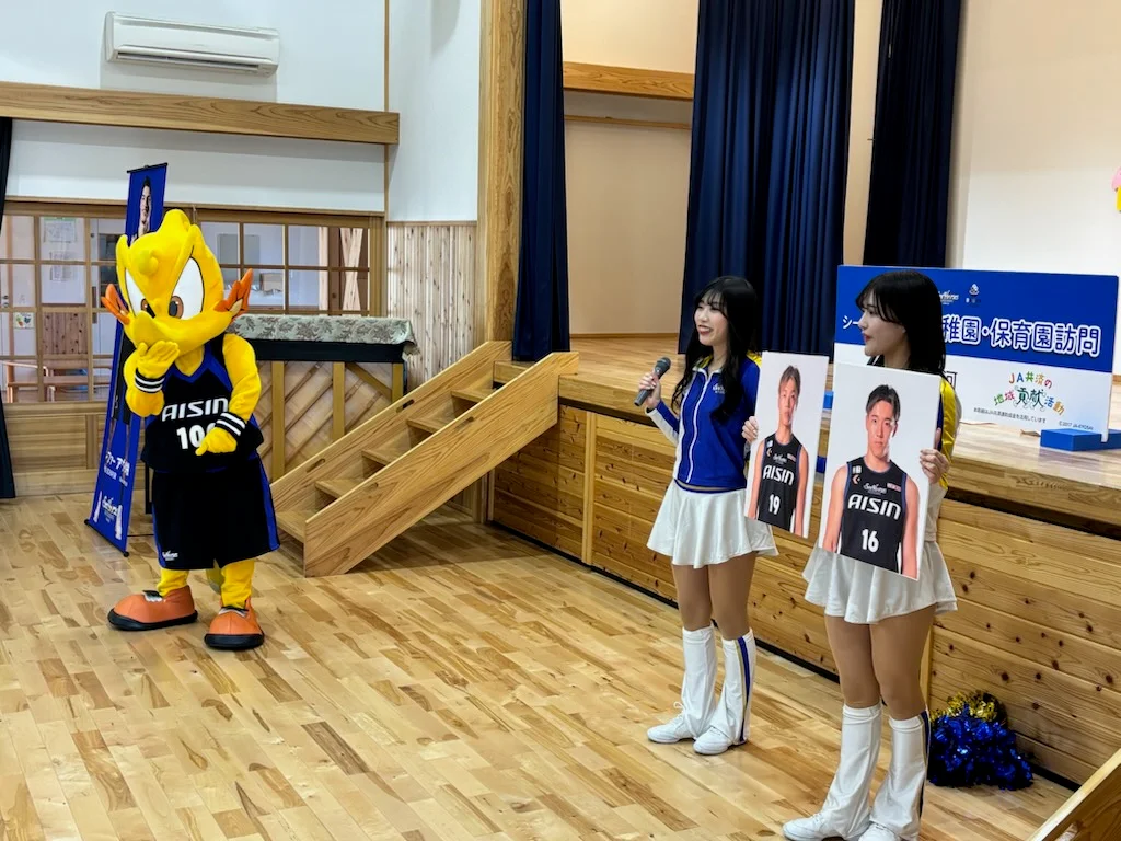 2026年1月19日(月)、シーホースくんとSuper GirlsのKAHO、MAHIRUがKIRARA保育園(西尾市)を訪問し、園児の皆さんと一緒にクイズやダンスを楽しみました。