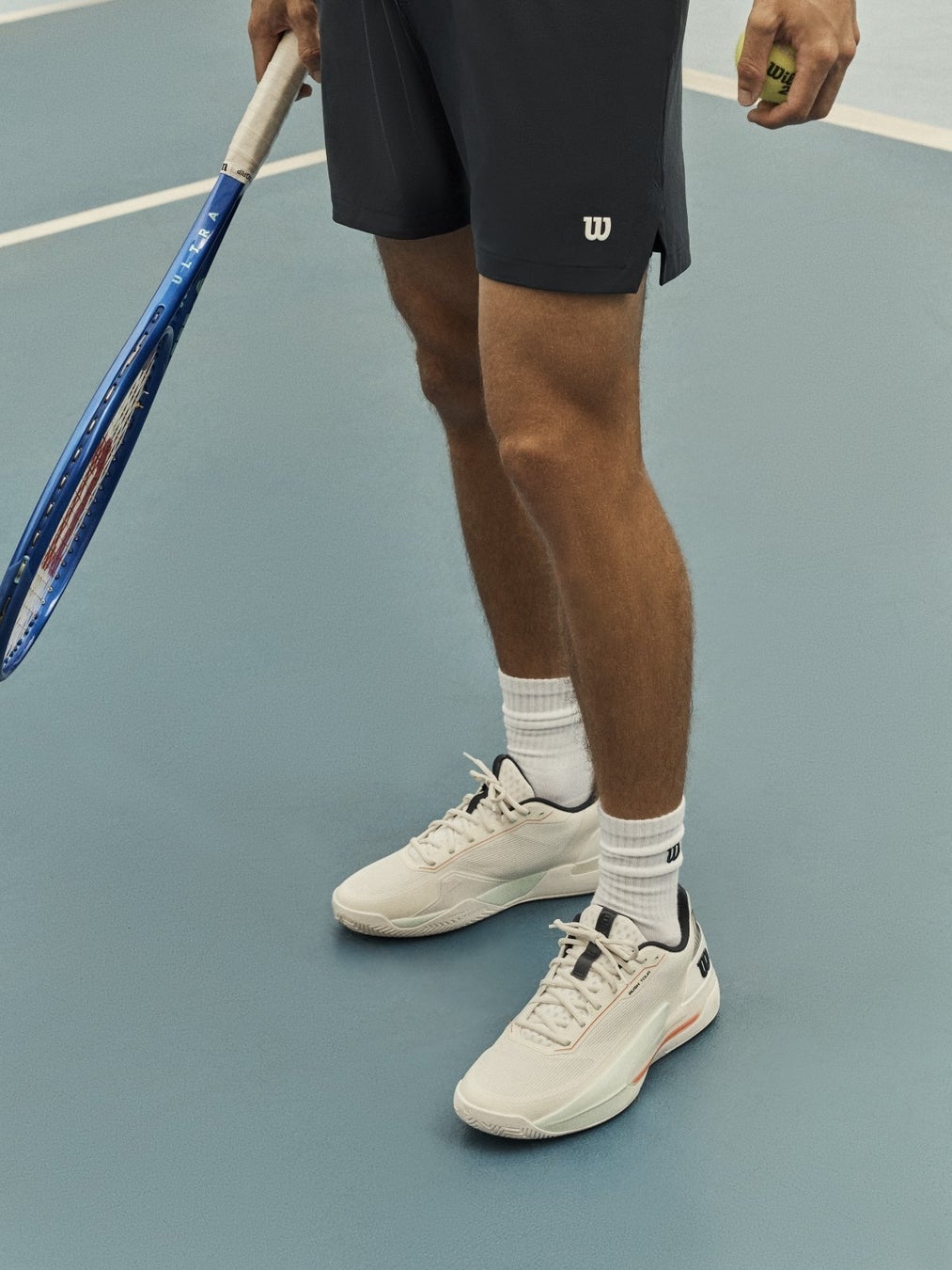 「Rush 5 Tourでの目標は、シンプルながらも野心的でした」と、ウイルソン・フットウェアデザイン担当シニアディレクターのテイト・カービスは述べています。「ダイナミックなあらゆる方向への動きをサポートしつつ、エリートプレーヤーが求めるコントロール性を維持したシューズを作りたかったのです。テニスはかつてないほど速く、フィジカルなスポーツになっており、フットウェアもそれに追いつかなければなりません。Rush 5 Tourは、まさにそのために作られた一足です。」