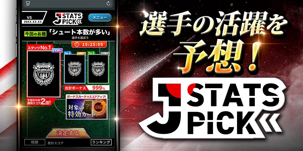 実際の試合データと連動した予想参加型コンテンツ「J STATS PICK」は今シーズンも開催。 試合ごとに設定される「テーマ(お題)」に合わせて活躍が期待される選手を3名選出し、実際の試合データに基づいたスコアでランキングを競います。 予想を的中させて上位に入賞すると、豪華報酬や限定カードを獲得可能です。さらに、特定のカードを所持・設定することで獲得スコアがアップする「特効」機能も搭載。集めたカードを活用し、戦略的に試合予想を楽しみましょう。