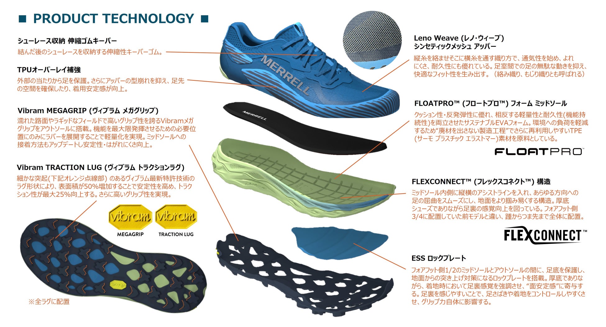 アッパーには、軽量で通気性、耐摩耗性に優れた“Leno Weave (レノ・ウィーブ)”を採用。伸縮性が低く、フィールドにおける激しい動きの際も足室内での足の無駄な遊びを抑えます。さらにアッパーサイドやシューレースホールまわりに配置されているTPUオーバーレイ補強も、設計やその面積を見直し、外的要因から足を保護するため耐久性を強化。ミッドソールには、相反する軽量性と耐久性(機能持続性)を合わせ持ち、反発弾性・クッション性に優れたサステナブルEVAフォーム“FLOATPRO™(フロートプロ)”を採用。また、ミッドソール内側上部に縦横のアシストラインを入れた“FLEXCONNECT™(フレックスコネクト)”構造により、路面の凹凸に応じてしなやかにソールを屈曲させ、スムーズな足の動きを助けます。併せて、ミッドソール足底部のフォアフット側1/2に、ESSロックプレートを張り合わせ、着地時における地面からの突き上げに対応し、さらに足裏の“面安定感”に寄与します。アウトソールには、世界有数のイタリアのソールメーカー「Vibram (ヴィブラム)」屈指のハイパフォーマンスグリップ“Vibram MEGAGRIP (ヴィブラム メガグリップ)”と、トラクション性・安定性を高めるVibram最新特許技術のラグ形状“Vibram TRACTION LUG (ヴィブラム トラクションラグ)”を全ラグに搭載し、さらにこだわりのラグパターン設計とラグ深5mmにより厳しいフィールドコンディションでも最高レベルのグリップ力を発揮します。この1足でショートからロングディスタンス、またはテクニカルな山岳地帯までオールインワンで活躍します。
