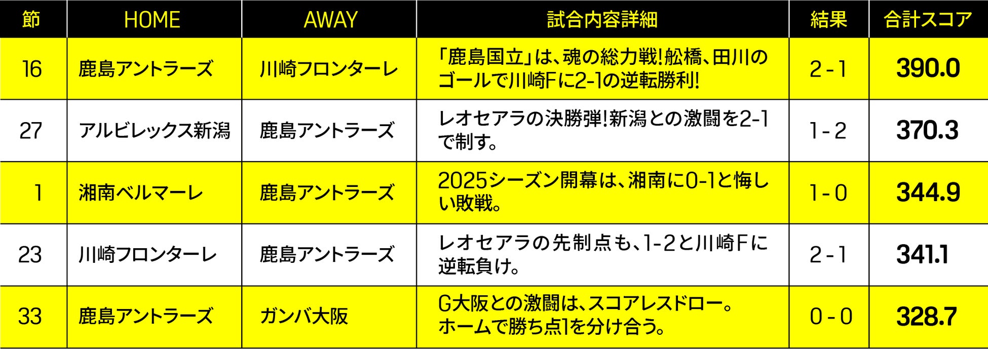 ■2025年 鹿島アントラーズ スポーツ感情スコアTOP5試合