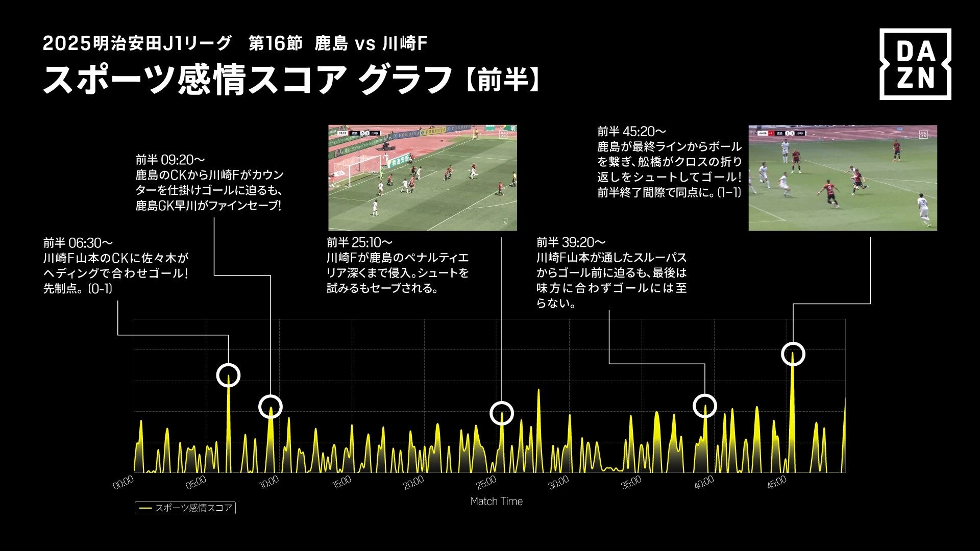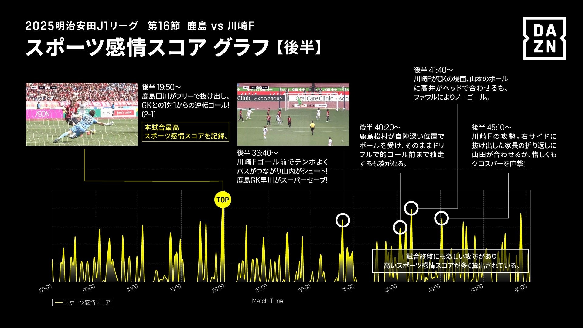 今回は第一弾として、2025明治安田J1リーグ 優勝の鹿島アントラーズ全38試合(対象:明治安田J1リーグ) のスポーツ感情スコアを算出。その結果、5月11日に国立競技場で行われた川崎フロンターレ戦が「390.0」と、最も高いスコアとなりました。最高スコアの要因は、国立競技場という特別な会場で選手のパフォーマンスが高められたこともあり、両チームともにカウンターの切れ味が鋭く、素早い試合展開の中で他の試合に比べて多くのシュートが発生したことが挙げられます。さらに、試合後半の鹿島アントラーズによるビッグセーブなど、守備の好プレーもスコアを底上げしました。また、瞬間最高スコアを記録したのは、鹿島・田川選手がフリーで抜け出し、GKとの1対1を制した劇的な逆転ゴールの瞬間でした。