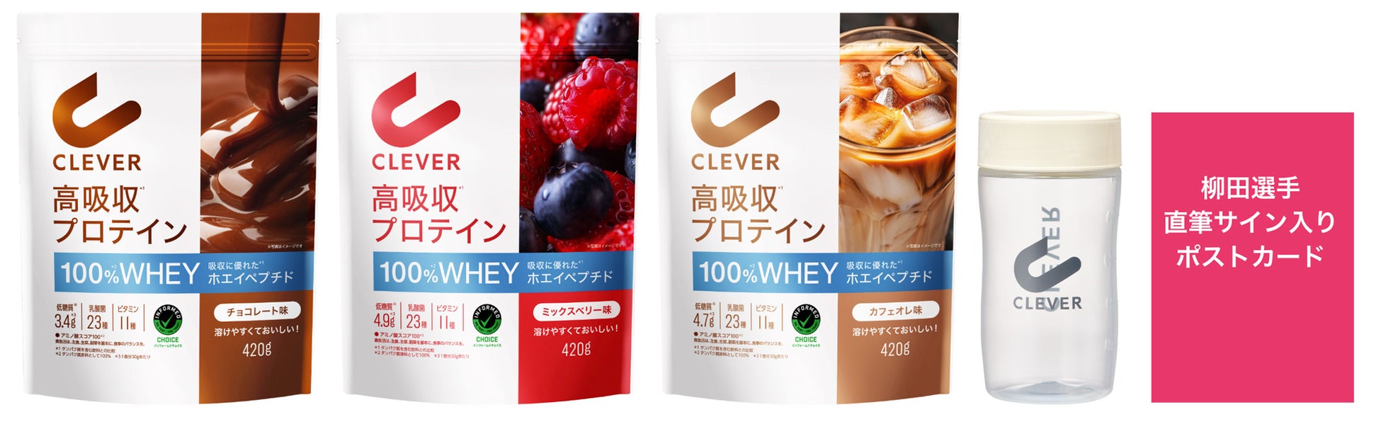 数量限定で『クレバー高吸収プロテイン』をご購入いただいたお客様に、柳田選手の限定ポストカード(全3種)をプレゼントいたします。