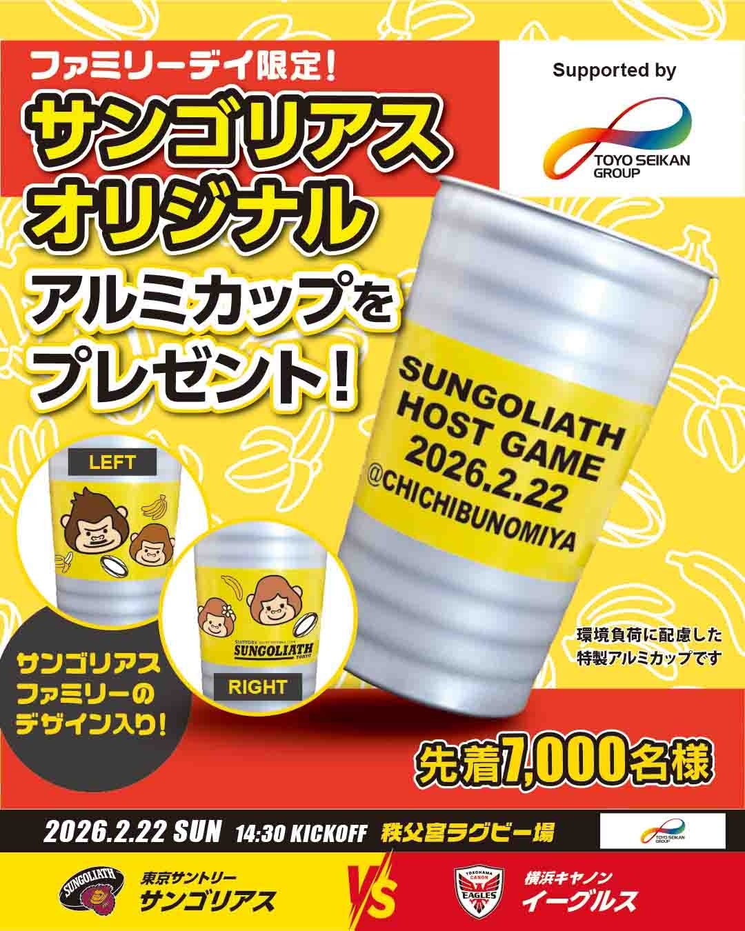 東洋製罐グループのご協賛で環境負荷に配慮した、東洋製罐グループの特製アルミカップを先着7,000名様にプレゼント!サンゴリアス君ファミリーのデザイン入り!観戦の記念に手に入れよう!