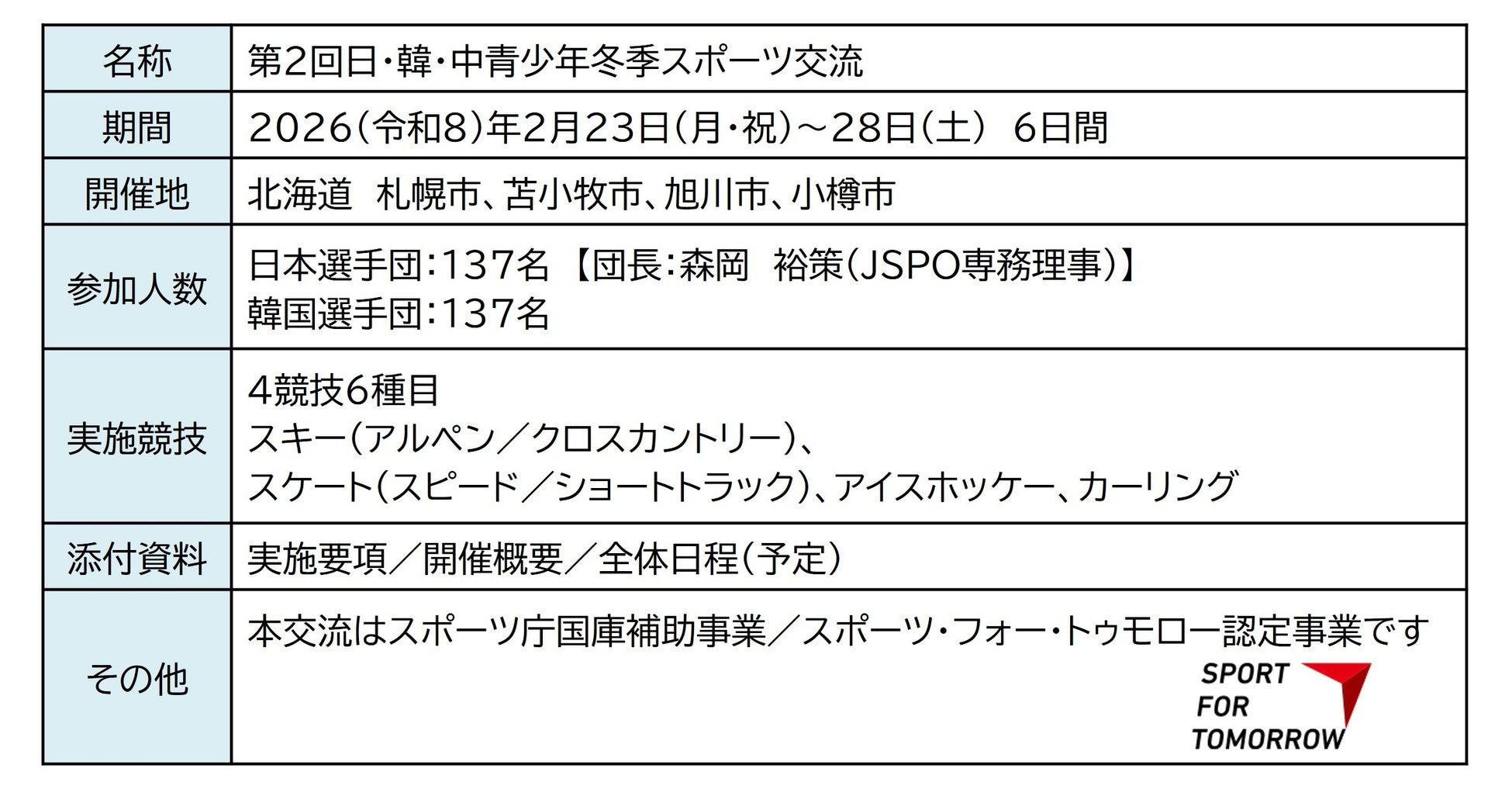 スポーツを「する」「みる」「ささえる」ための環境づくりを行うJSPO(正式名称:公益財団法人日本スポーツ協会 東京都新宿区/会長 遠藤利明)は、来る2026(令和8)年2月23日~28日の期間、北海道にて標記交流を開催します。