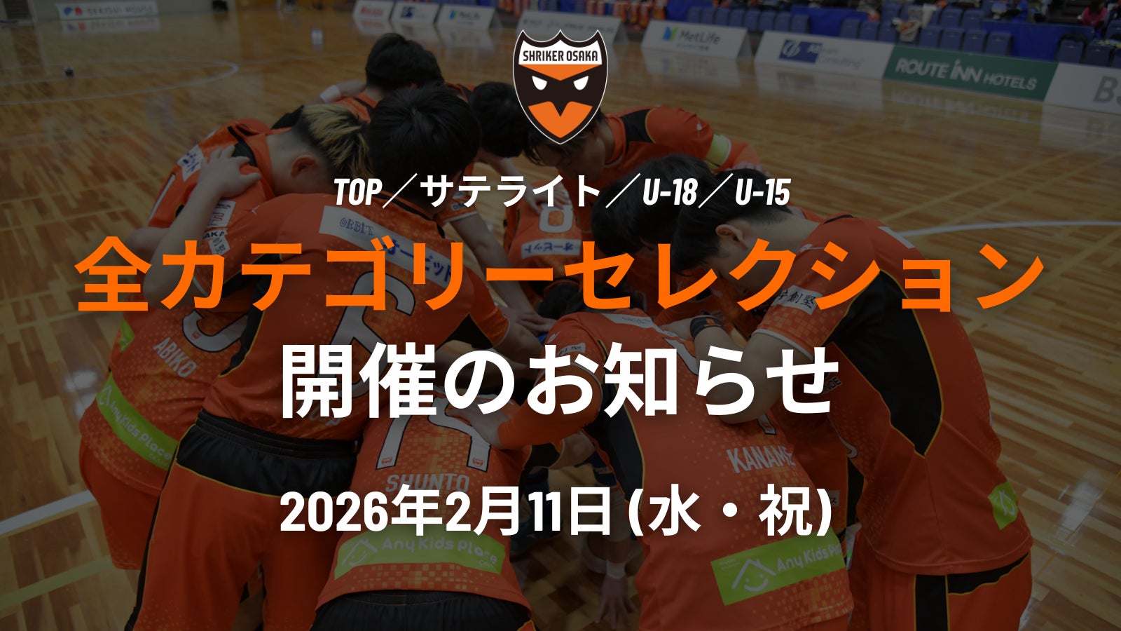 2月11日(水・祝)に開催されます、シュライカー大阪全カテゴリー(TOP・サテライト/U-18/U-15)セレクションの応募期間が延長になりましたのでお知らせいたします。