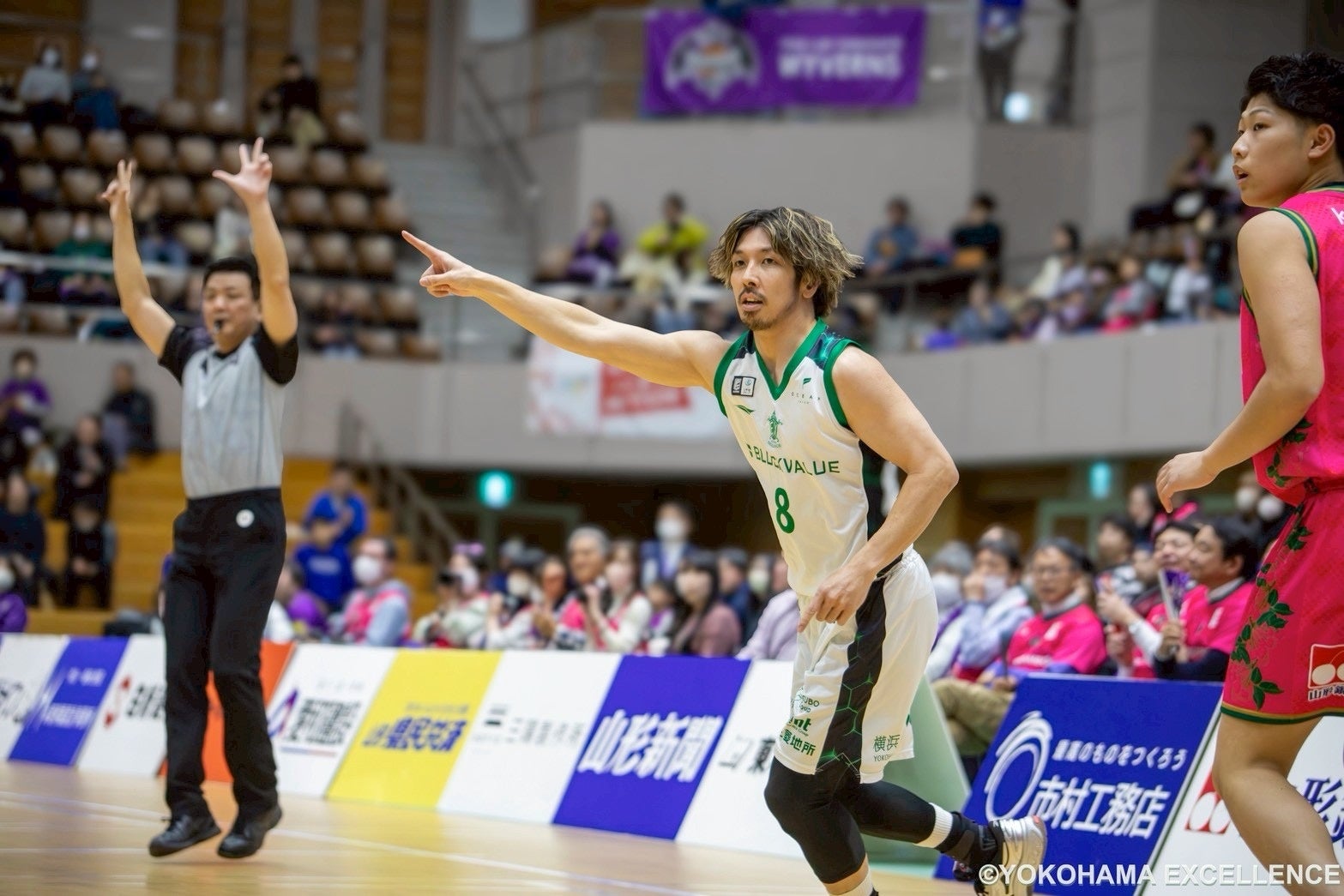 復帰後最初に放った3Pシュートは惜しくも決まらなかったものの、「山形63-70横浜EX」とリードした状態を保ったまま3Q終了。