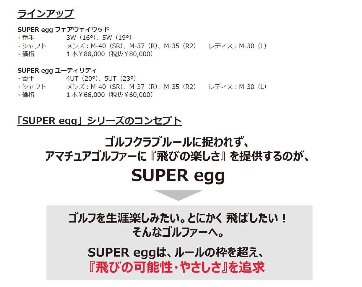 (株)プロギアは、SLEルール適合外の高反発設計で、飛距離が落ちてきたゴルファーに飛ばす楽しみを提供し続ける「SUPER egg(スーパー・エッグ)」シリーズから、高反発フェースと六角形状の高剛性ボディで飛びとやさしさを徹底追及した「SUPER eggフェアウェイウッド」と「SUPER eggユーティリティ」を3月13日から発売します。