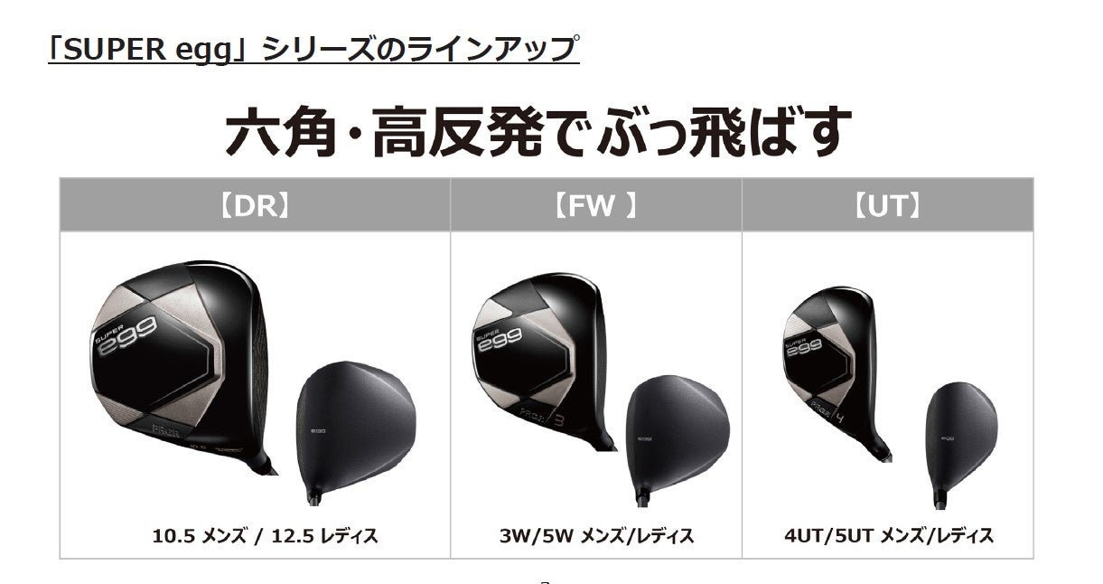 (株)プロギアは、SLEルール適合外の高反発設計で、飛距離が落ちてきたゴルファーに飛ばす楽しみを提供し続ける「SUPER egg(スーパー・エッグ)」シリーズから、高反発フェースと六角形状の高剛性ボディで飛びとやさしさを徹底追及した「SUPER eggフェアウェイウッド」と「SUPER eggユーティリティ」を3月13日から発売します。