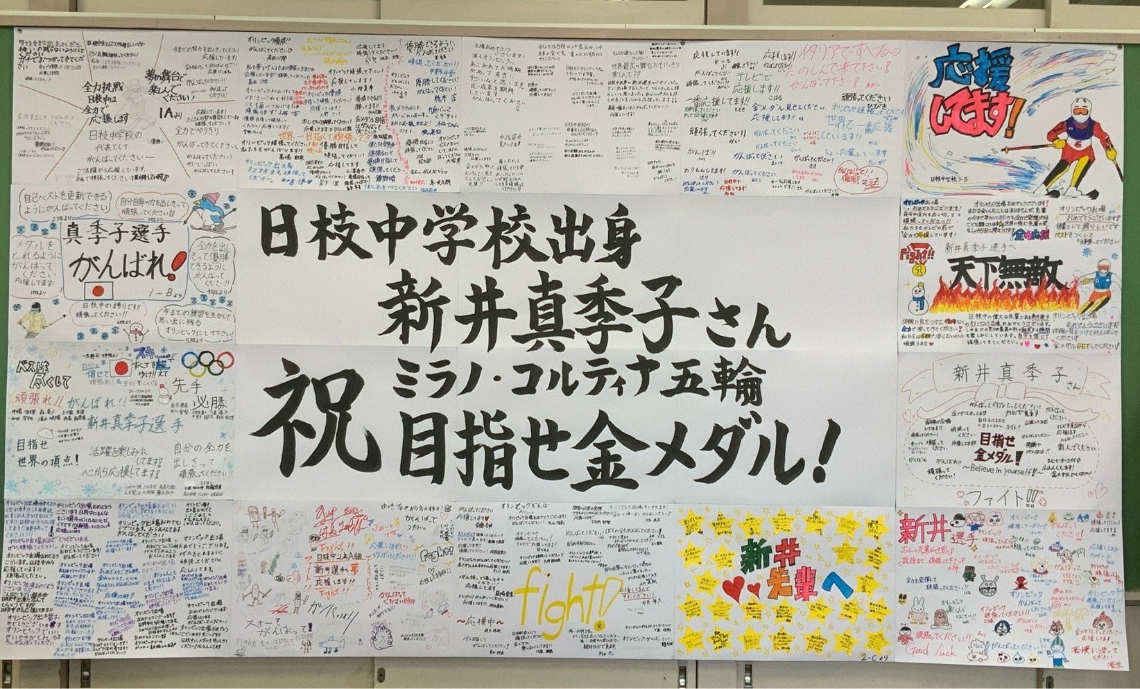 市役所庁舎や道路沿い、市内のスキー場などに横断幕を掲げ、応援ムードが高まっています。また、出身校である日枝中学校の皆さんからも応援メッセージが送られるなど、競技開始を心待ちにしています。