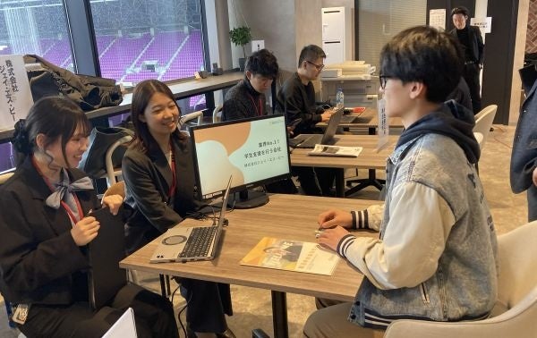 会議室などで行われる就職面接ではなく、円卓・テーブルなどで身近に対面して、気軽に対談ができる空間で、学生さんたちにも好評を得ていました。