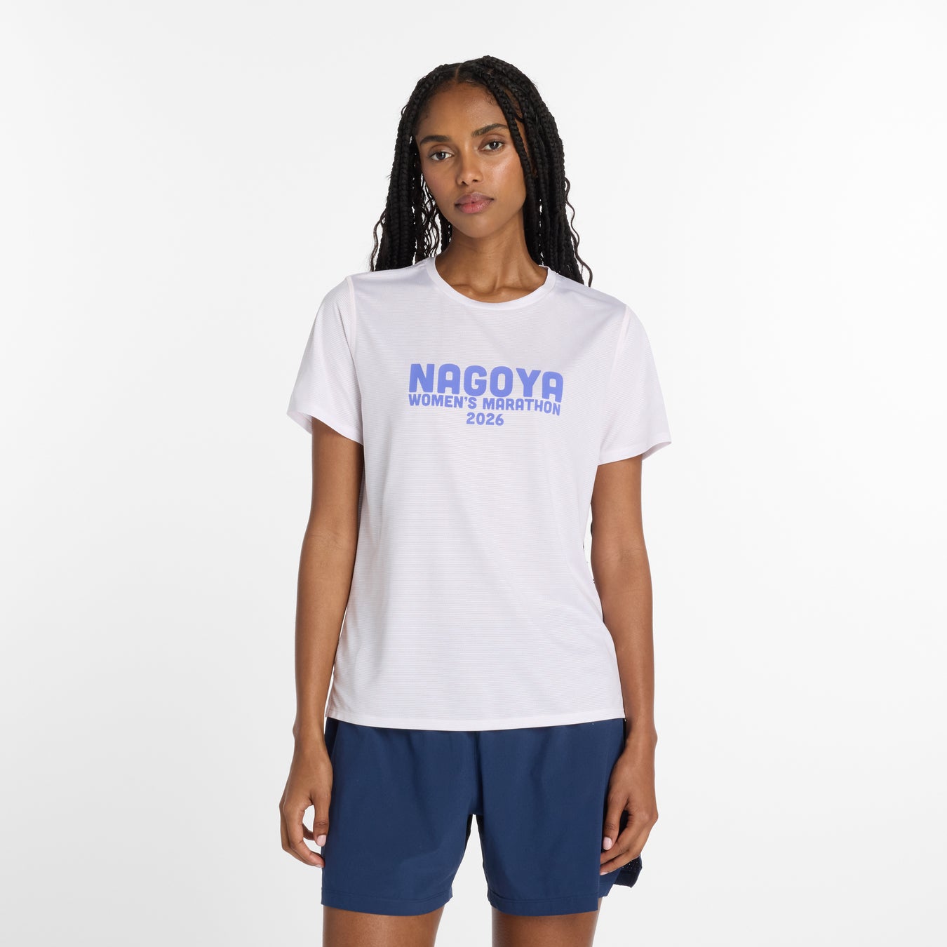 「名古屋ウィメンズマラソン2026」限定のショートスリーブTシャツ。和を意識した小紋柄のオールオーバープリントと、胸元の大会ロゴがデザインポイント。通気性に優れたストライプメッシュと、前後差のあるサイドスリットが快適な走りをサポート。大会を華やかに演出する一枚。