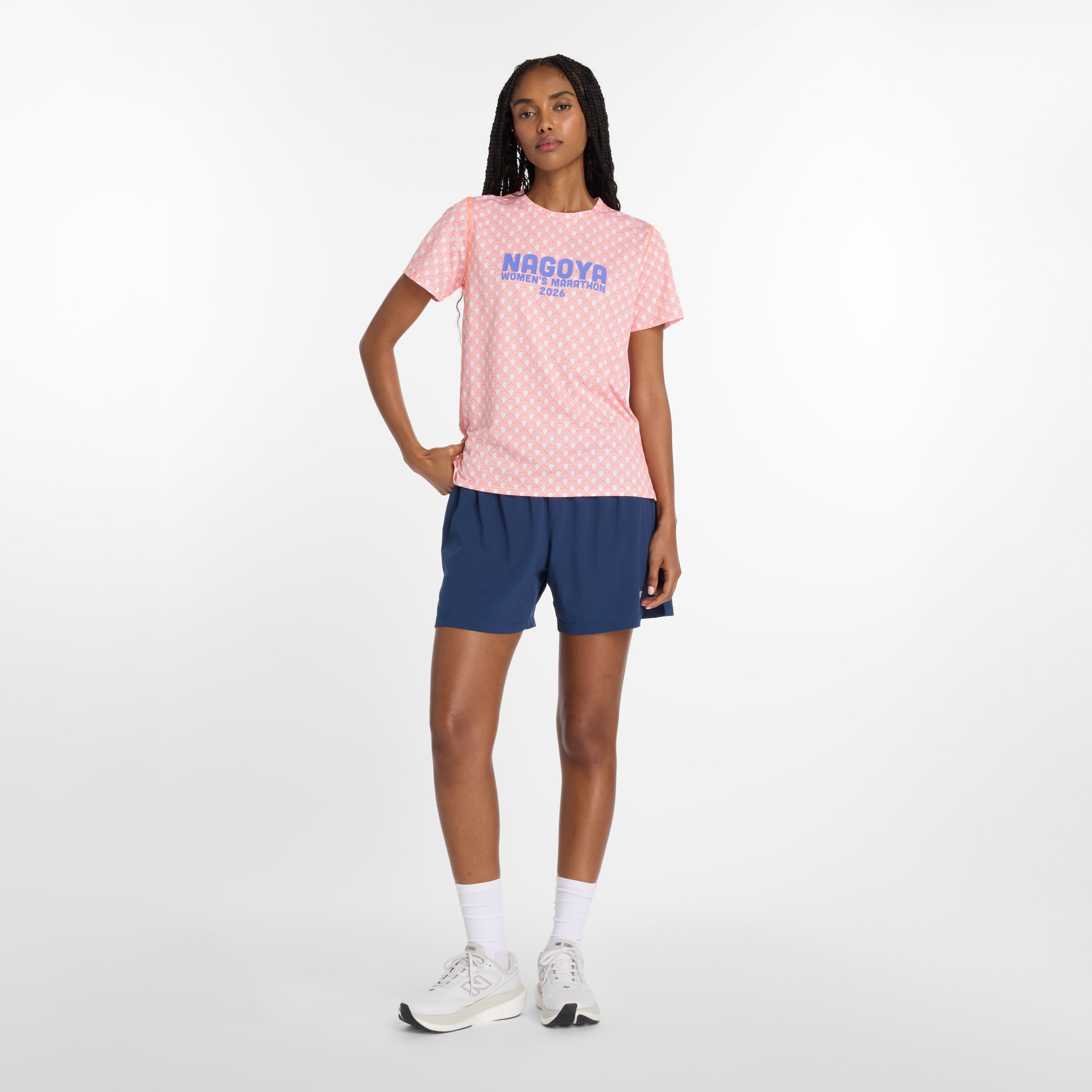 「名古屋ウィメンズマラソン2026」限定のショートスリーブTシャツ。和を意識した小紋柄のオールオーバープリントと、胸元の大会ロゴがデザインポイント。通気性に優れたストライプメッシュと、前後差のあるサイドスリットが快適な走りをサポート。大会を華やかに演出する一枚。