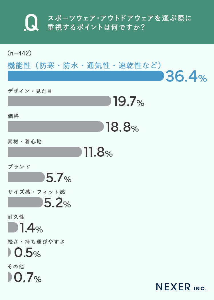 もっとも多かったのは「機能性(防寒・防水・通気性・速乾性など)」で36.4%でした。次いで「デザイン・見た目」が19.7%、「価格」が18.8%と続いています。
