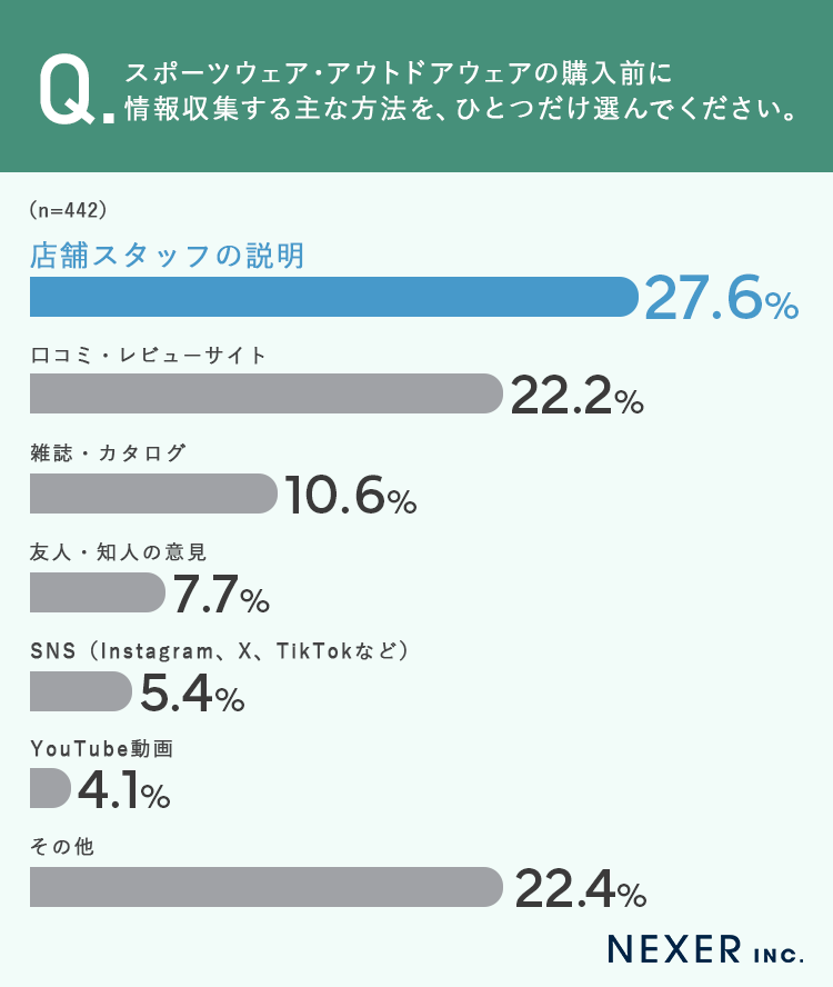 ということで今回はSNJ STOREと共同で、事前調査で「スポーツウェアやアウトドアウェアを購入したことがある」と回答した全国442名を対象に「スポーツウェア・アウトドアウェアの選び方」についてのアンケートをおこないました。
