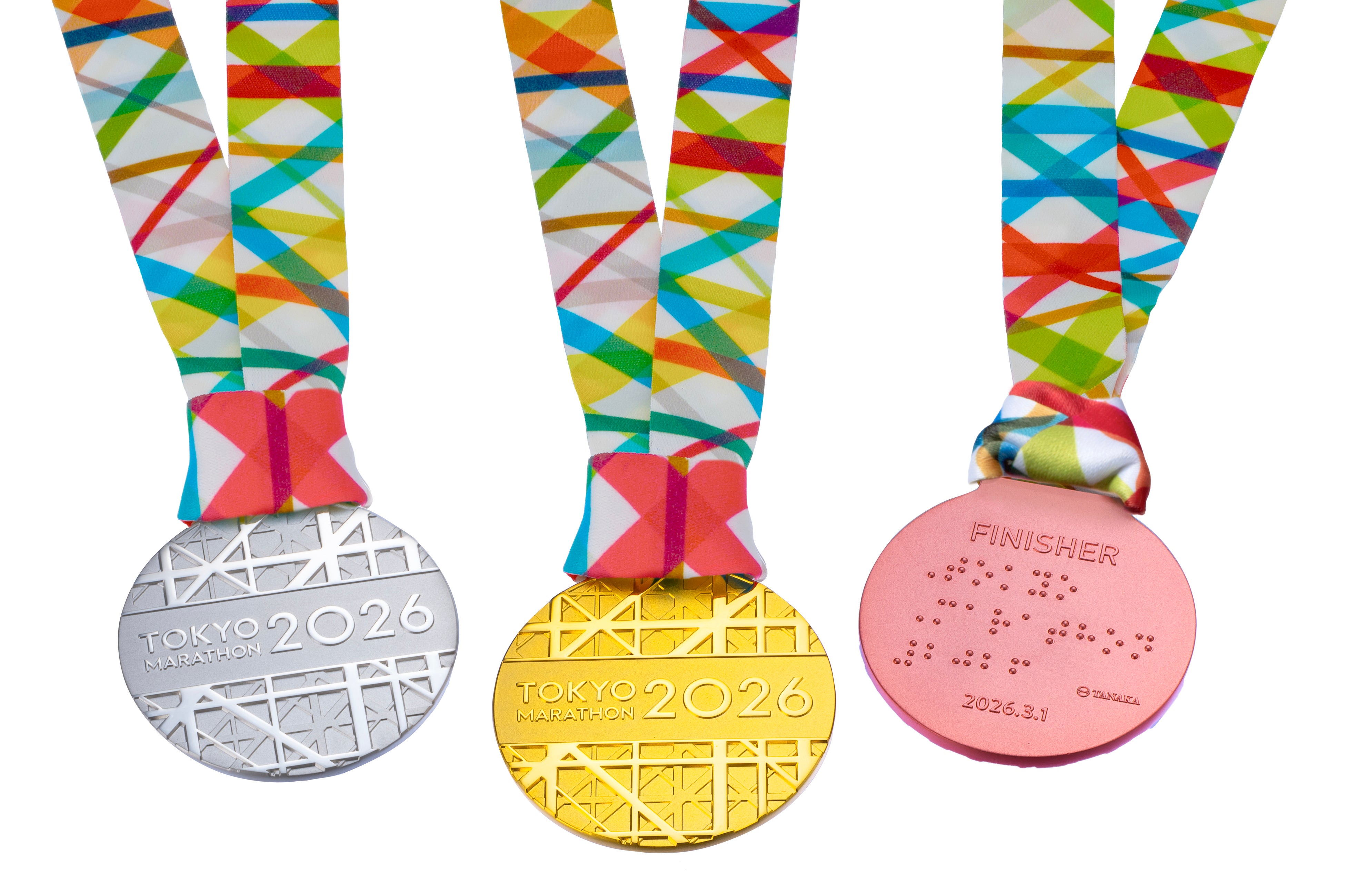また、メダルの裏面には「東京マラソン2026」の大会名を点字でデザインし、田中貴金属のロゴに加えて、「FINISHER」の文字と大会の日付を刻みました。メダルリボンのデザインは、2016年大会から引き継がれている「ランナー」「ボランティア」「観衆」の一人ひとりを表す一本一本の線が織り重なったタペストリーのような大会ロゴをモチーフにしています。