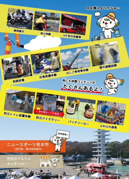 当イベントでは、最新のバーチャルリアリティ技術を活用し〈これまでにない臨場感あふれる防災訓練〉を体験できるVR防災体験車や防災トイレ設置体験、制服試着など、防災にまつわる体験プログラムを多数実施いたします。また、防災クイズラリーや防災食・防災グッズ展示販売、ふわふわ遊具も予定しておりますので、子供から大人まで、大切な知識を楽しみながら身につけていただくことができます。さらに、アンケートにお答えいただくと先着順で「オリジナル2WAYバッグ」をプレゼントいたします。